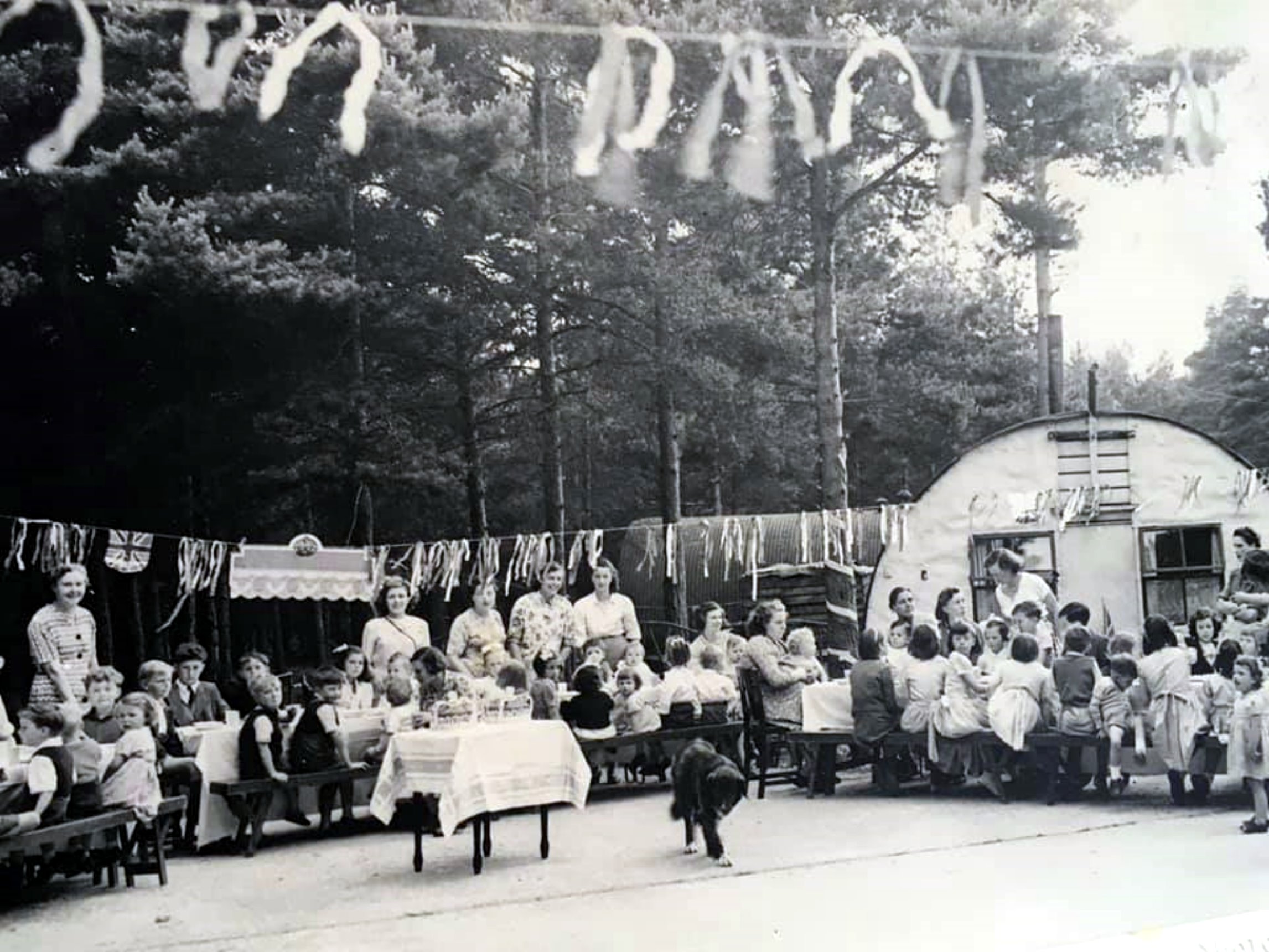 1948 Kids Party for all the children outside one of the Holmsley South large Nissen Hut (Communal Site 3), with Mrs Sheila Moss and Mrs Betty Whitaker as adult helpers in the background, photograph credit from Woodie (Newcastle Upon Tyne) Link Here