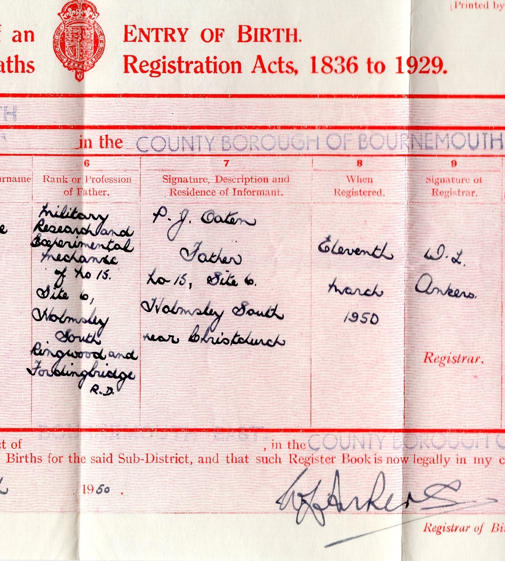 Their address is listed as No. 15, Site 6, Holmsley South as shown on part of my birth certificate. I was born in Royal Victoria Hospital in Boscombe on March 10, 1950. On another document the address is shown as 31 Oak Grove, Holmsley South.