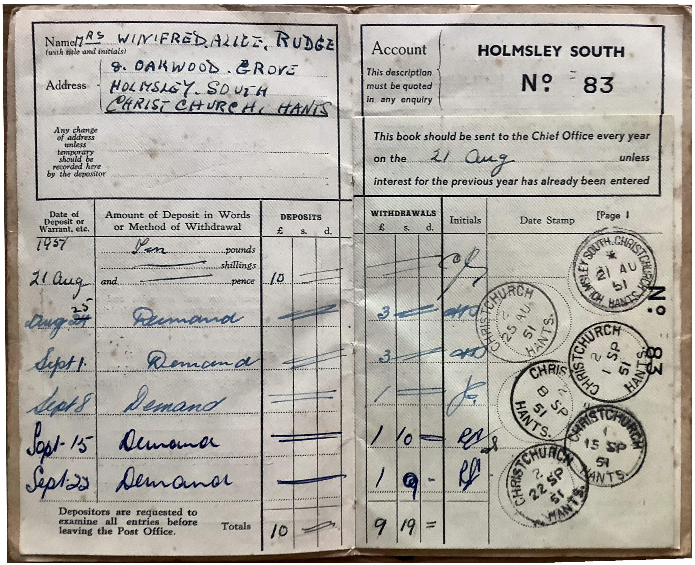 Recieving correspondance from Mark Rudge, who Grandmother, Mrs Winifred Alice Rudge who lived at Holmsley, opened a Post Officer Saving Book, and has Holmsley South stamped on the front. The initial entry is stamped on the 21 August 1951 at Holmsley South, 8 Oakwood Grove, Holmsley South, Christchurch, Hants. Oh dear the Holmsley post office gave a missleading address on her PO Book. That said, so what, whilst families were at Holmsley South many PO books, ration and ID Cards many area names where wrongly worded written in by the person who wrote the name and address working in the post office. I've heard many additional names such as 'Pine tree grove, Beech nut grove and Harrowing Crescent'). That said, postman knew where the actual address sould be. Eventually, Mark's grandparents Arthur & Winifred Rudge who lived at Oak Grove for some years, then moved into a new council house at 2 Druitt Road, Somerford, Christchurch about 1954.
